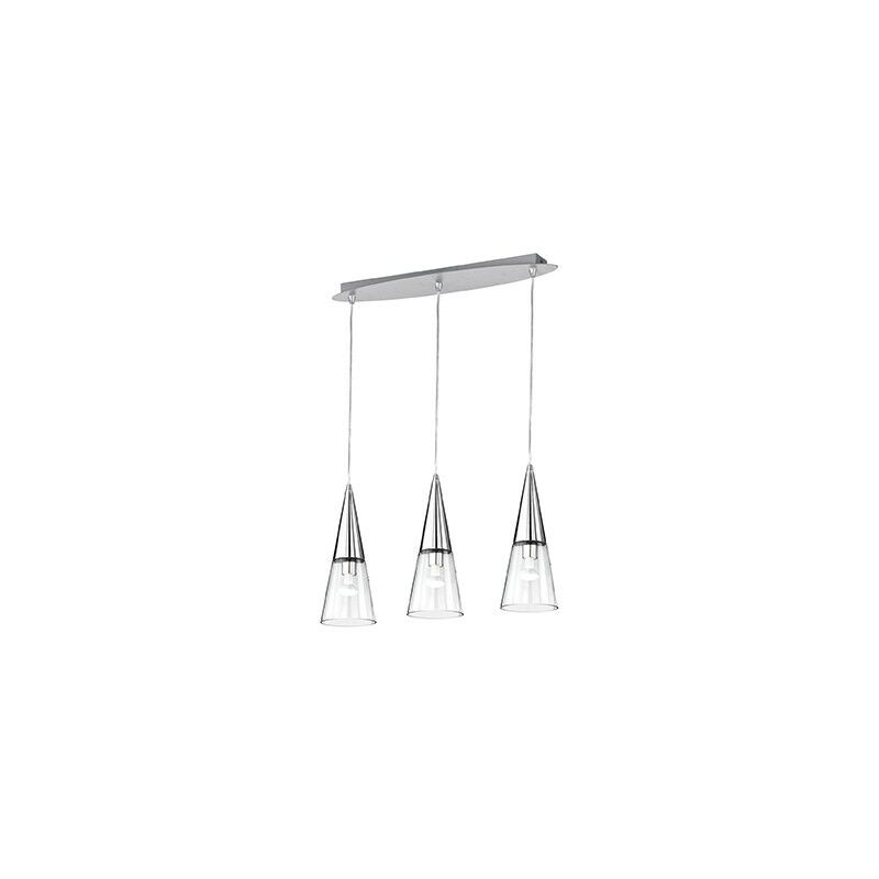 Montatura e copri porta lampade in metallo cromato. Cavi elettrici regolabili in lunghezza. Diffusore in vetro trasparente soffiato a mano con fascia sabbiata. IP:20 Lampadina inclusa L 600 x H min 500 / max 1300 x P 150 mm max 3 x 40W E14 / 240V