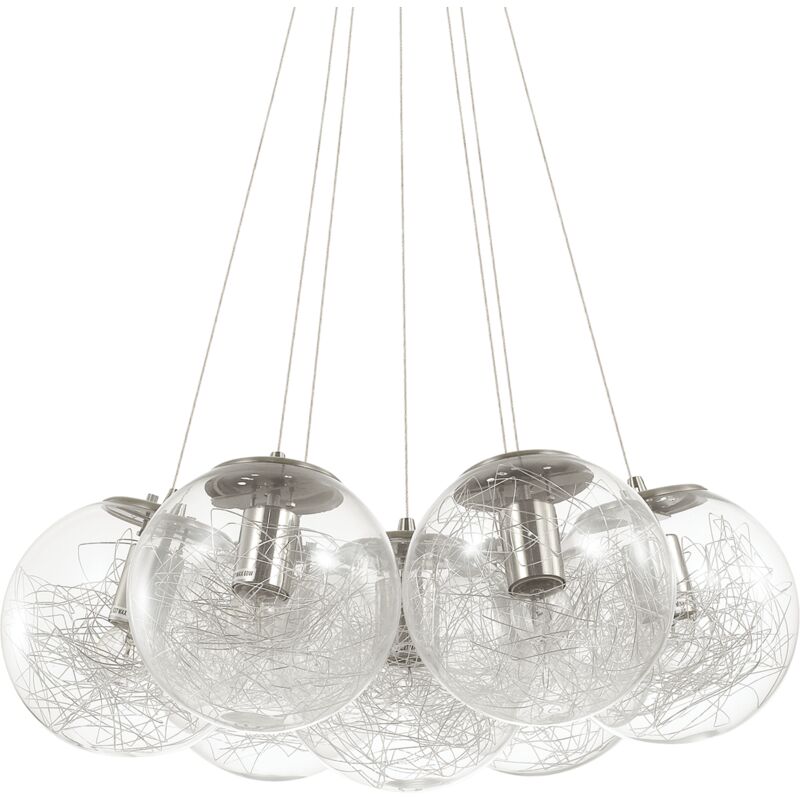 Montatura in metallo con finitura nickel o ottone. Diffusore in vetro soffiato trasparente con decoro interno in filo d'alluminio. Ø 60 x H min 45 / max 140 cm max 7 x 60W E27 IP20
