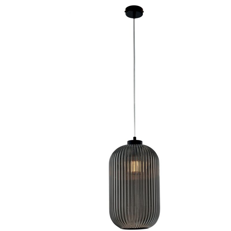Collezione Krizia UN TOCCO DISTINTIVO E RAFFINATO Sospensione a una luce in ferro laccato nero con cavo elettrico regolabile. Diffusore in vetro soffiato grigio specchiato con decoro rigatura in rilievo effetto plissè.. Diffusore in vetro soffiato grigio specchiato con decoro rigatura in rilievo effetto plissè. Il vetro soffiato garantisce un'elevata qualità e una bellezza artigianale. La rigatura in rilievo con effetto plissé aggiunge texture e interesse visivo. Ogni pezzo è unico, grazie al processo di produzione manuale. Si adatta a una vasta gamma di stili di arredamento, dal moderno al classico, grazie al mix di materiali e finiture.