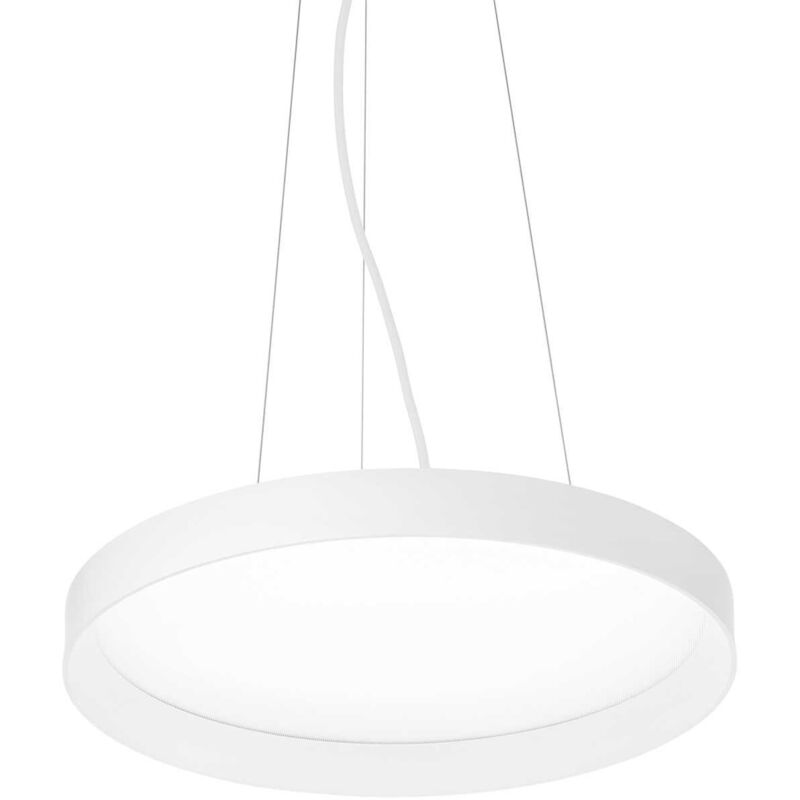 Collezione Fly FONTI LUMINOSE ADATTE AD OGNI AMBIENTE Sospensione con base circolare diam.35 cm e corpo luce in alluminio verniciato a polveri.. Diffusore in PMMA microprismatizzato con controllo dell'abbagliamento. Sorgente luminosa a LED 18 W integrata 3000 K luce calda