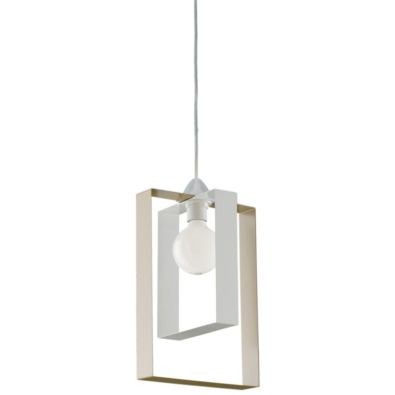 Collezione Duplo SOSPENSIONI COLORATE PER AMBIENTI VERY COOL Sospensione a 1 luce, realizzata con due fasce in metallo rettangolari sagomate a mano ed intersecate tra di loro. . Le fasce sono laccate color bianco e tortora. L'altezza è regolabile grazie al cavetto in dotazione. Questa serie di lampade con la sua linea colorata si adatta ad arredamenti giovani e moderni, ed è capace di illuminare creando un' atmosfera fresca e vivace, soprattutto per cucina, camera dei bambini, bagni, ingressi. Realizzati interamente a mano da mastri artigiani, con prodotti 100% Made in Italy.