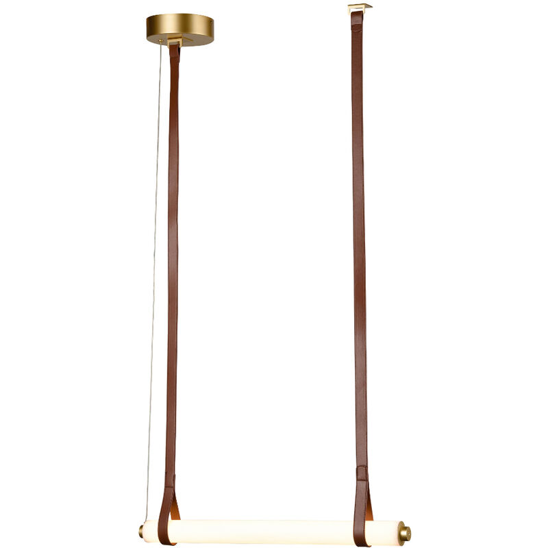 Collezione Teneria DESIGN ORIGINALE Lampada a sospensione a LED per l'illuminazione di soggiorni moderni. Design minimalista con diffusore tubolare sospeso orizzontalmente. Il diffusore è in policarbonato, sospeso nell'aria da due strisce di pelle sintetica marrone. Sorgente luminosa Led da 40 watt, resa luminosa 3150 lumen, temperatura colore 3000k (luce calda). Plafoniera a LED progettata per l'illuminazione decorativa.