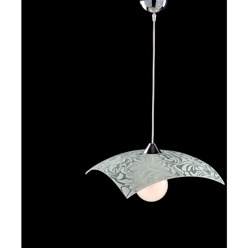 Collezione Marmo DESIGN SEMPLICE E DI TENDENZA IN VETRO SERIGRAFATO Sospensione a 1 luce con dettagli in metallo cromato e ampio diffusore in vetro 40x40 serigrafato con leggiadri ghirigori tonalità bianco con apertura a fazzoletto. Altezza regolabile e disponibile anche di diametro superiore. Un disegno gradevole ed suadente per ambienti moderni.
