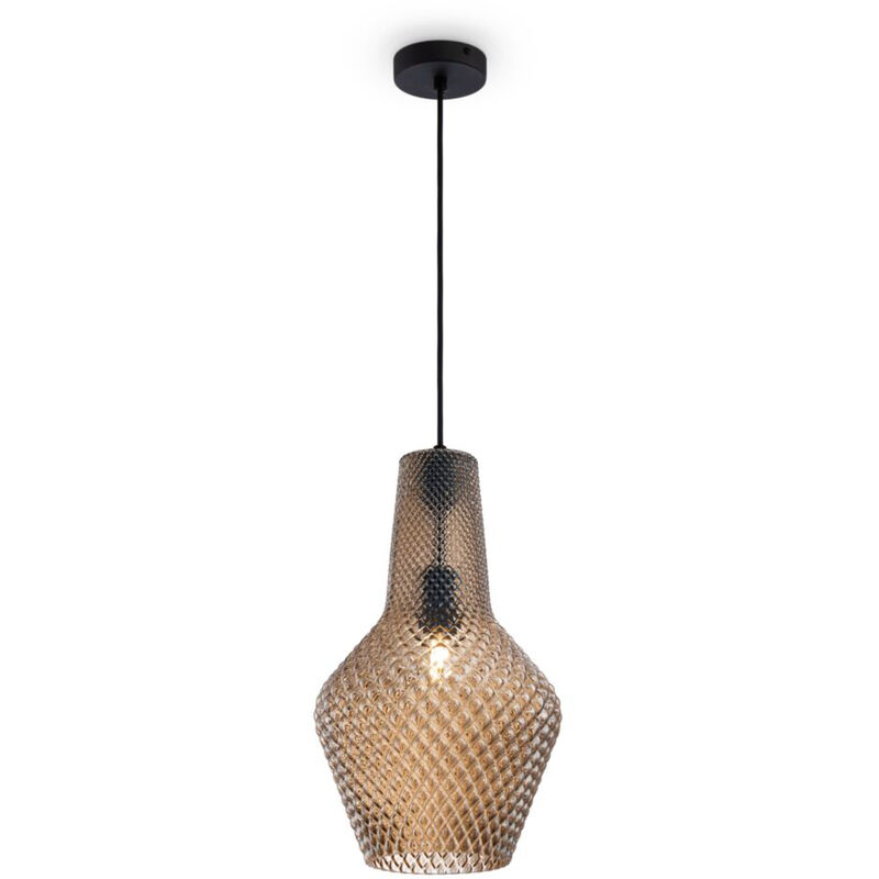 Collezione Tommy VETRO ELEGANTE E MODERNO Sospensione 1 Luce E27 (non inclusa) in vetro soffiato ambra e rosone in metallo laccato nero. Altezza regolabile tramite cavo. Il vetro presenta delle rigature con decoro a rombo. Sopensione dallo stile moderno e giovane si adatta a qualsiasi ambiente