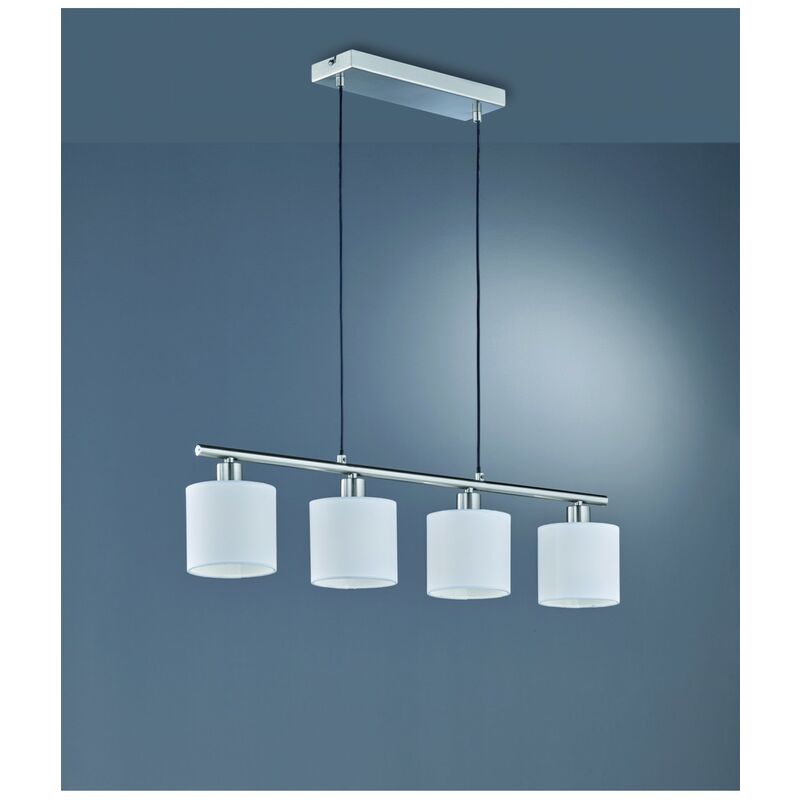 Sospensione 4 Luci Nichel L75 cm La sospensione TOMMY di Trio Lighting presenta un profilo in metallo finitura nichel opaco, cavi regolabili e 4 paralumi cilindrici in tessuto bianco. Cavi regolabili in lunghezza. Dotata di 4 alloggi per lampadine E14 max 28 watt (acquistabili separatamente). Un elemento dal design semplice e moderno, adatto a diverse zone della vostra casa, ideale ad esempio per illuminare il tavolo della sala da pranzo o la penisola della cucina. Disponibile anche la variante nella finitura nero opaco con paralumi nero e interno oro. Caratteristiche: Profilo in metallo finitura nichel opaco Cavi regolabili in lunghezza 4 paralumi cilindrici in tessuto bianco 4 alloggi per lampadine E14 max 28 watt (acquistabili separatamente) Design semplice e moderno Adatto a diverse zone della casa Ideale per illuminare il tavolo della sala da pranzo o la penisola della cucina Disponibile anche nella variante nero opaco con paralumi nero e interno oro