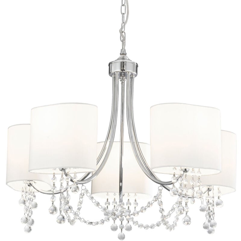 Collezione Nina ELEGANTI GOCCE DI CRISTALLO Questa lampada a sospensione a 5 luci Nina cromata con perline di cristallo e paralumi in tessuto bianco è elegante e sofisticata. I paralumi sono realizzati in tessuto bianco di qualità e sono fissati al raccordo principale tramite eleganti bracci curvi rifiniti in cromo. La montatura è decorata con delicate perle di cristallo e catene che pendono con grazia sotto i paralumi. E le cinque luci illuminano magnificamente la stanza.