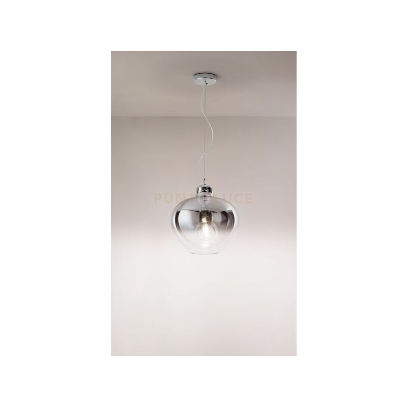 Sospensione con montatura in metallo cromo lucido e vetro trasparente con sfumatura.