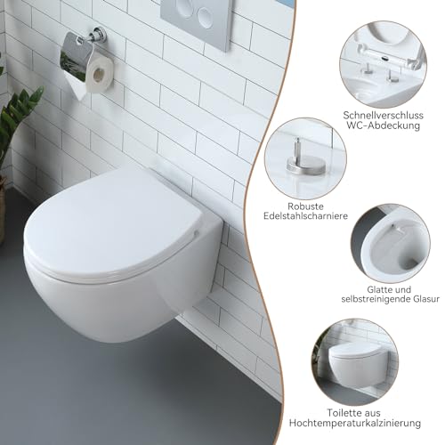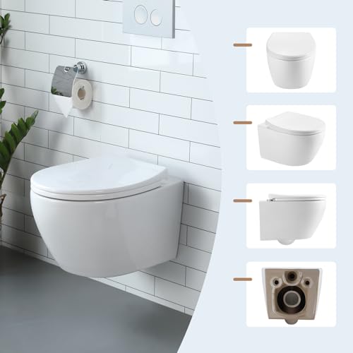 WC sospeso in ceramica con coperchio WC con abbassamento automatico - Ciotola WC con risciacquo superspin monoforo, WC bianco con rivestimento nano - 52 × 37 × 34,5 cm