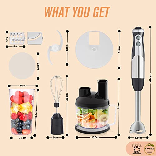 PRESTAZIONI POTENZE: Il frullatore a immersione è dotato di un potente motore a corrente continua da 800 watt progettato per funzionare senza problemi con un suono minimo. La lama in acciaio inossidabile consente di mescolare una varietà di alimenti e schiacciarli in modo uniforme.