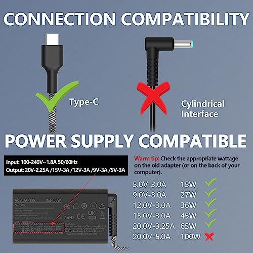 Sottile Alimentatore GaN 65W USB C Type Tipo C Viaggi Caricatore per Dell Latitude 5520 5420 5410 HP Spectre x360 Elitebook x360 840 Envy x360 ProBook x360 Chromebook x360 11 Caricabatteria Adattatore