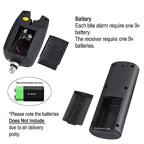 Impostazioni personalizzate sveglia: il volume e il tono di ogni sveglia possono essere regolati individualmente. La gamma di toni di alta qualità più ti offre un'esperienza sonora diversa. 4 diversi colori di luci a LED in modo da poter giudicare facilmente la canna da pesca che sta funzionando. Luce di memoria di 20 secondi. 1 batteria da 9 V (esclusa).