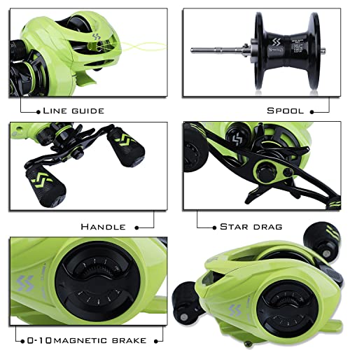 Mulinello Baitcasting eccezionale - Il mulinello Baitcasting Sougayilang è dotato di un rapporto ad alta velocità liscio di 8,0:1, 9 + 1 cuscinetti in acciaio inossidabile e 10 freni magnetici ad alta resistenza. La configurazione superiore ti aiuta a combattere i pesci grossi fino a 18 libbre. Consente di affrontare facilmente vari ambienti di pesca complessi. La guida in ceramica a forma di O protegge al massimo la tua linea di pesca.