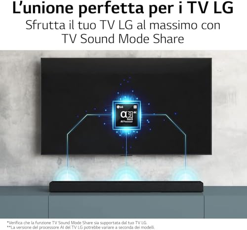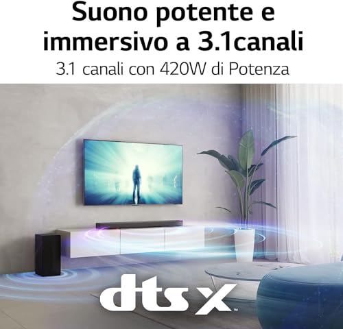 LG S65Q Soundbar TV 420W, 3.1 Canali con Subwoofer Wireless, Audio Meridian Horizon, DTS Virtual:X, AI Sound Pro, Audio ad Alta Risoluzione, Bluetooth, Ingresso Ottico, HDMI in/out