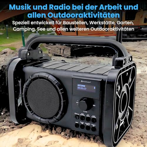 Soundmaster Radio DAB80SW da cantiere con DAB+ FM Bluetooth e batteria agli ioni di litio IP44, resistente alla polvere e agli spruzzi d'acqua, Nero