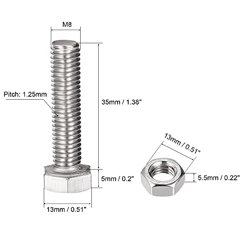 Sourcing map M8 x 35mm Esagonale Testa Viti Bulloni Dadi Piatti e Blocco Rondelle Kit 304 Acciaio Inossidabile Acciaio Completamente Filo Esagonale Bulloni 10 Set