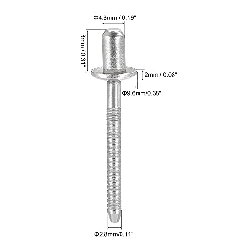Sourcing map Rivetti ciechi, in acciaio inox 304, rivetti per la decorazione del nucleo, 4,8 mm, diametro 8 mm, lunghezza dell'impugnatura chiusa, tono argento, 50 pezzi