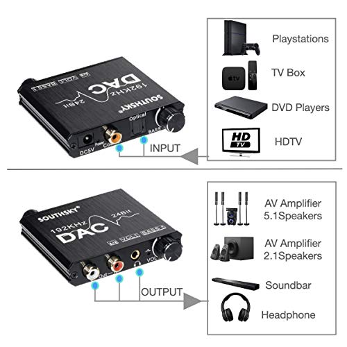 SOUTHSKY Convertitore audio da 192 kHz DAC, controllo del volume BASS, convertitore audio digitale a analogico, SPDIF coassiale a 2 RCA e jack per cuffie da 3,5 mm