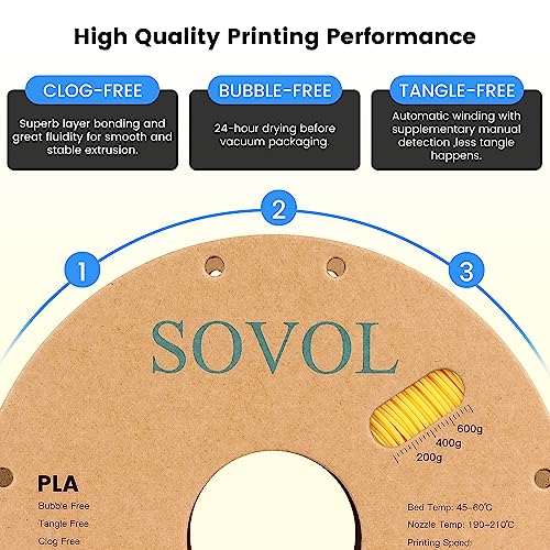 [Senza intasamento e senza bolle d'aria] - Progettato e prodotto con brevetto clog-free per garantire un'esperienza di stampa regolare e stabile con queste ricariche di PLA. Sovol PLA Filametn è sigillato sotto vuoto con un essiccante per proteggere il filamento dall'umidità e ottenere una stampa di alta precisione.