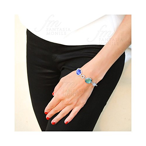 Sovrani Bijoux, Bracciale Donna in ottone anallergico finitura rodio, Pietre: cristalli color acquamarina, cristalli color blu e zirconi, occhio di gatto celeste, Lunghezza 20cm circa, Consegna in 48 ore, isole escluse