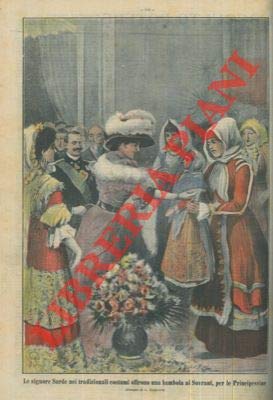 I sovrani a Palermo per i 50 anni della liberazione della Sicilia. = Le signore sarde nei tradizionali costuni offrono una bambola ai sovrani, per le principessine.