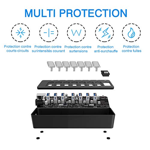 SOWTECH USB Hub 3.0 Alimentato 7 Porte USB 3.0 Hub (7 Porte di Ricarica e trasferimento Dati) con Interruttore ON/off con Adattatore di Alimentazione 12V/2A per MacBook/Windows/Laptop/PC/Cellulare