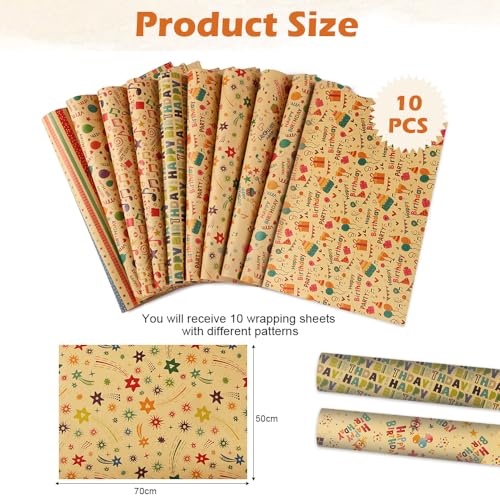 Sozakka 10 Carta da Regalo Kraft Fogli Carta Regalo Compleanno Rotolo Carta Regalo Bambini Carta da Regalo Vintage Carta per Incartare Regali Riciclata Carta da Imballaggio per Anniversari Regali