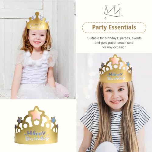 SET CORONA DI COMPLEANNO: Riceverete 20 cappelli corona di carta dorata per feste + 2 adesivi con pietre preziose colorate e super brillanti. I cappelli corona sono disponibili in 4 stili da 5 cappelli ciascuno, il che li rende un set ideale per feste di compleanno.