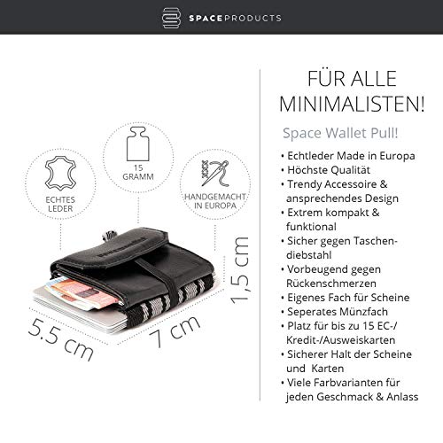 Space Wallet 2.0 - Portafoglio compatto, in vera pelle, con tasca portamonete e laccio in tessuto elastico;