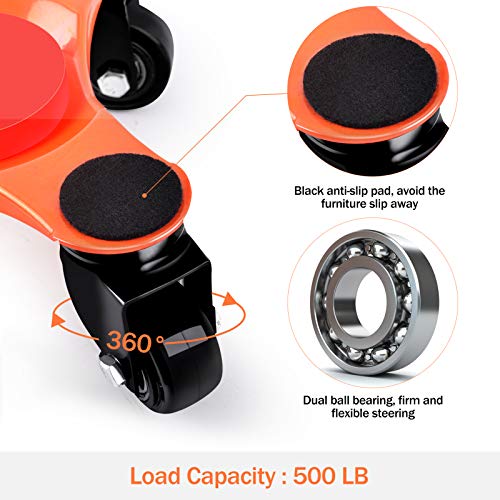 【Carrello di costruzione durevole】La struttura del telaio in acciaio con rivestimento di potere arancione addensato e il doppio cuscinetto a sfere offrono un forte supporto del carico. Tre cuscinetti antiscivolo in schiuma su ciascun carrello mobile a triangolo offrono una migliore presa e protezione ai mobili.