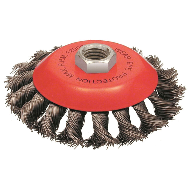 SPAZZOLA ABRASIVA CIRCOLARE CONICA A MAZZETTI RITORTI CEBO Spazzola in filo di acciaio temperato liscio adatte per forti raschiature,asportazioni di gomma su metallo, sbavature di particolari tranciati e ingranaggi. CARATTERISTICHE: Diametro: 100 mm Foro: M14 Filo: Acciaio 0,4 Velocità max: 12000 rpm PRODOTTO DI QUALITA' LA FATTURA VIENE EMESSA PER IMPORTI SUPERIORI A € 20 E VA RICHIESTA AL MOMENTO DELL'ACQUISTO