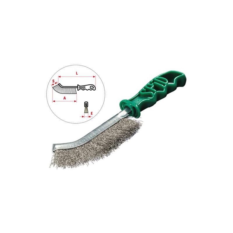 Spazzole Spid inox Spazzola manuale universale. La superficie ristretta, la particolare curvatura ed il manico ergonomico consentono di lavorare con forte pressione e di raggiungere spazi di difficile accesso Ideale per rimuovere ruggine, vernice e sporco da qualsiasi superficie. Filo in acciaio inox Ø 0,3 mm. Dimensioni: L 245 mm. - A 135 mm. - S 28 mm. - E 15 mm.