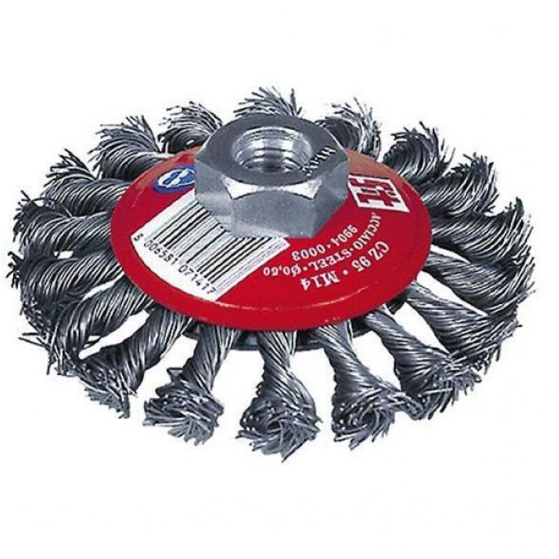 Filo in acciaio a mazzetti ritorti. Foro M14. La forma conica rende queste spazzole adatte a lavori di taglio su superfici irregolari, con spigoli, profili e fessure. Ideale per rimozione di scorie, ruggine e residui da superfici di ogni materiale e forma.