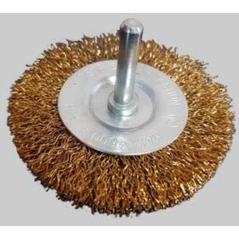 Filamenti in acciaio ottonato ondulato. Gambo mm.6x25. Per un utilizzo prevalente su utensili portatili ad alta velocit... di rotazione, per lavori di abrasione laterale e pulitura di superfici. Spazzola circolare ideal star con gambo ø 75 mm IDEAL STAR Spazzole acciaio ideal star