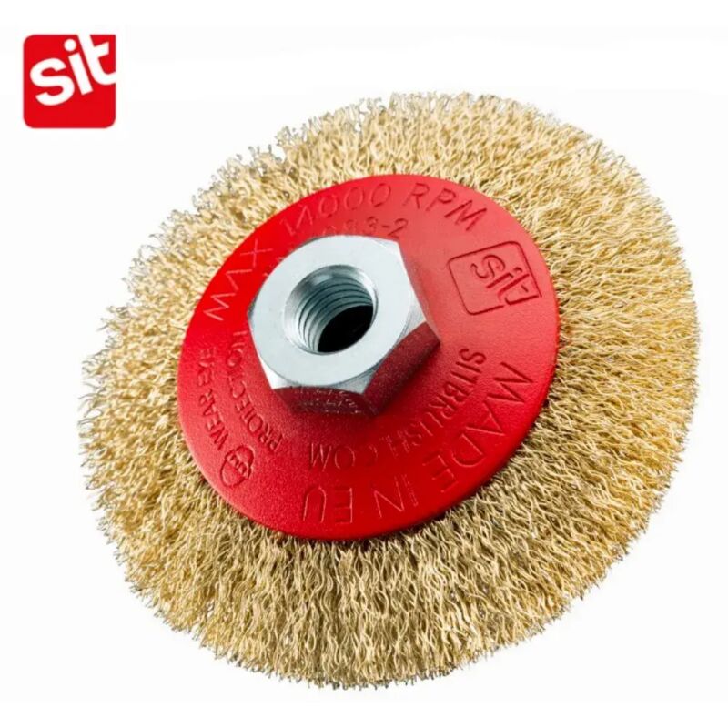Spazzole coniche a filo ondulato in acciaio foro M14 per smerigliatrici angolari. La forma conica rende queste spazzole adatte per lavori di taglio su superfici irregolari, con spigoli, profili e fessure. In acciaio ondulato ad altissima resistenza. Applicabile per la rimozione di scorie, ruggine e residui da superfici di ogni materiale e forma.