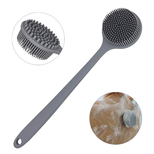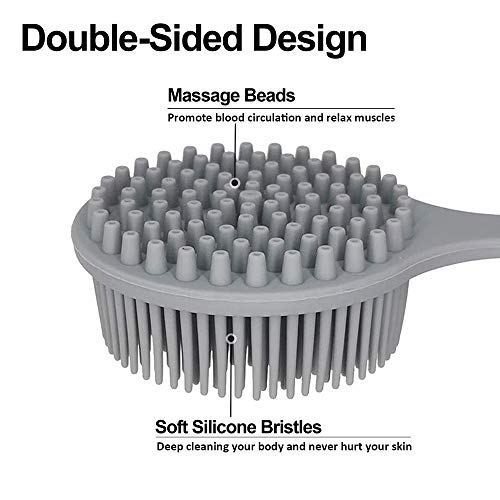 Spazzola per il corpo in silicone, spazzola per doccia con setole morbide e manico lungo, per massaggiatore esfoliante a doppia faccia (grigio)