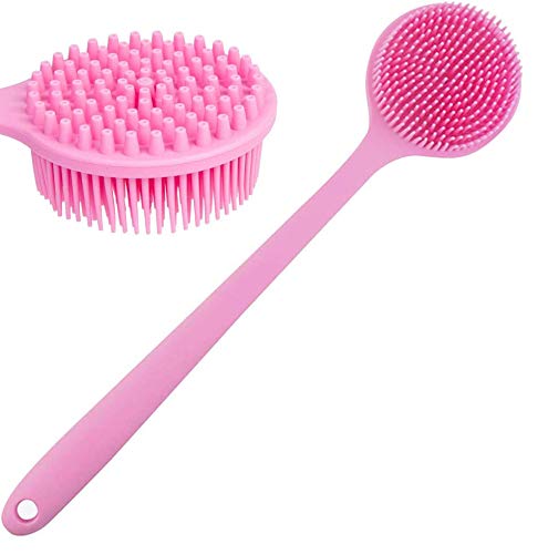 Spazzola per il corpo in silicone, spazzola per doccia con setole morbide e manico lungo, per massaggiatore a doppia faccia (rosa)