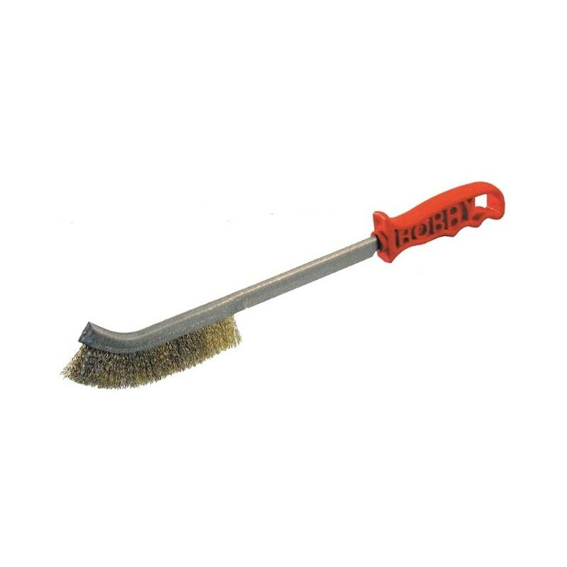 Spazzola curva con dorso metallico, fili ondulati in acciaio e manico in plastica. Dimensioni: 260x28 mm.