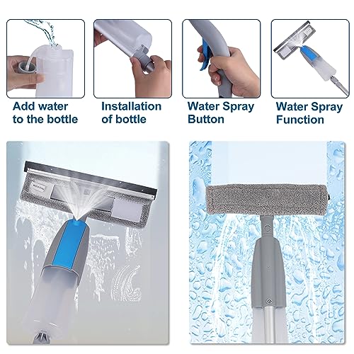 Funzione spray: c'è una bottiglia nella parte superiore della spazzola lavavetri che può essere riempita con acqua o soluzione detergente. Quando si è pronti per l'uso, premere il pulsante sul manico per spruzzare acqua. Pulisci facilmente le finestre e dì addio al secchio!