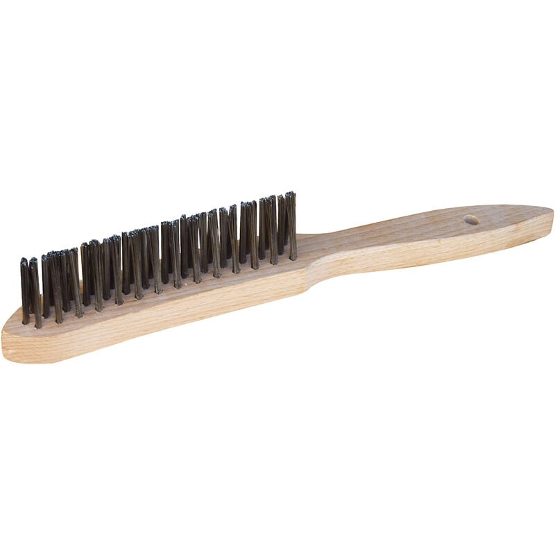 Telaio in legno, fili in acciaio duro a 3 file, a punta. Spazzola ideale per lavorare in angoli o scanalature. Lunghezza totale: 280 mm.