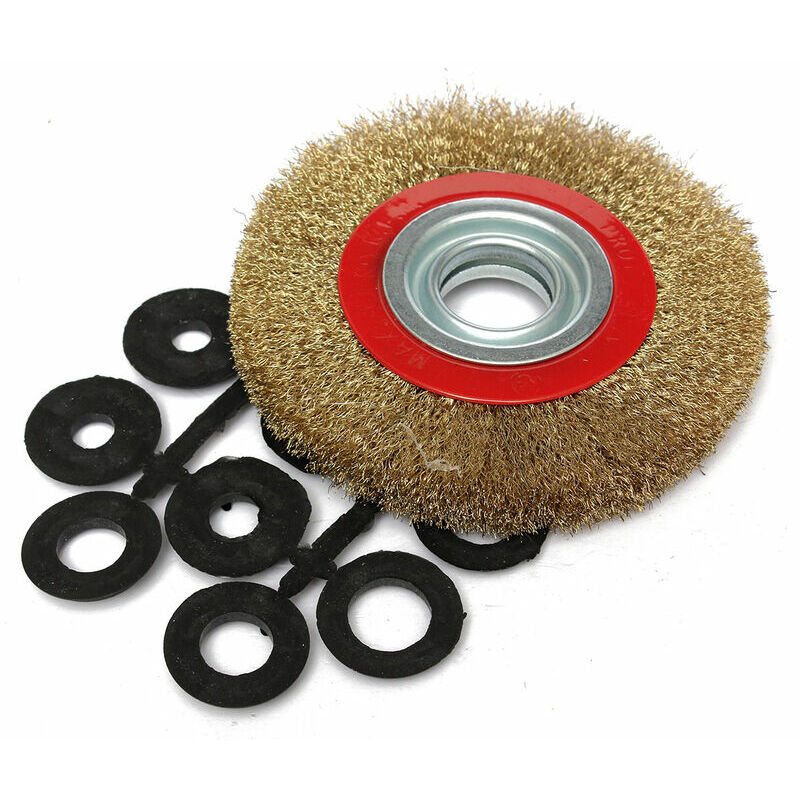 Contenuto della confezione: 1 spazzola per ruote in acciaio da 15,2 cm 10 adattatori Diametro totale: 153 mm Diametro foro: 32 mm Spessore: 22 mm Adattatori: 10 pezzi (2x 1'/26 mm, 2x 7/8'/22 mm, 2x 3/4'/19 mm, 2x 5/8'/16 mm, 2x 1/2 "/ 13 mm) Cerchi in acciaio, placcati per prevenire la corrosione. Adatto per sbavare, rimuovere ruggine, pulire superfici...