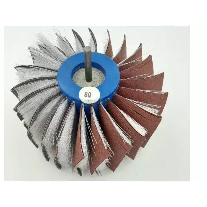 Spazzola circolare, con gambo, fatta di setole e strisce di tela abrasiva La spazzola ha la grande capacità di adattarsi a qualsiasi forma con la massima aggressività. E' adatta alla levigatura del legno con profili sia concavi che convessi tipo: aste, perline, battiscopa, profili sagomati in genere Inoltre è molto efficace per la carteggiatura di fondi duri come il poliuretano e il poliestere Viene utilizzata anche per levigatura del metallo. Diametro del gambo: 8 mm Diametro della spazzola: 200 mm Larghezza della spazzola: 100 mm Lunghezza delle strisce abrasive: 60 mm Grana: 80