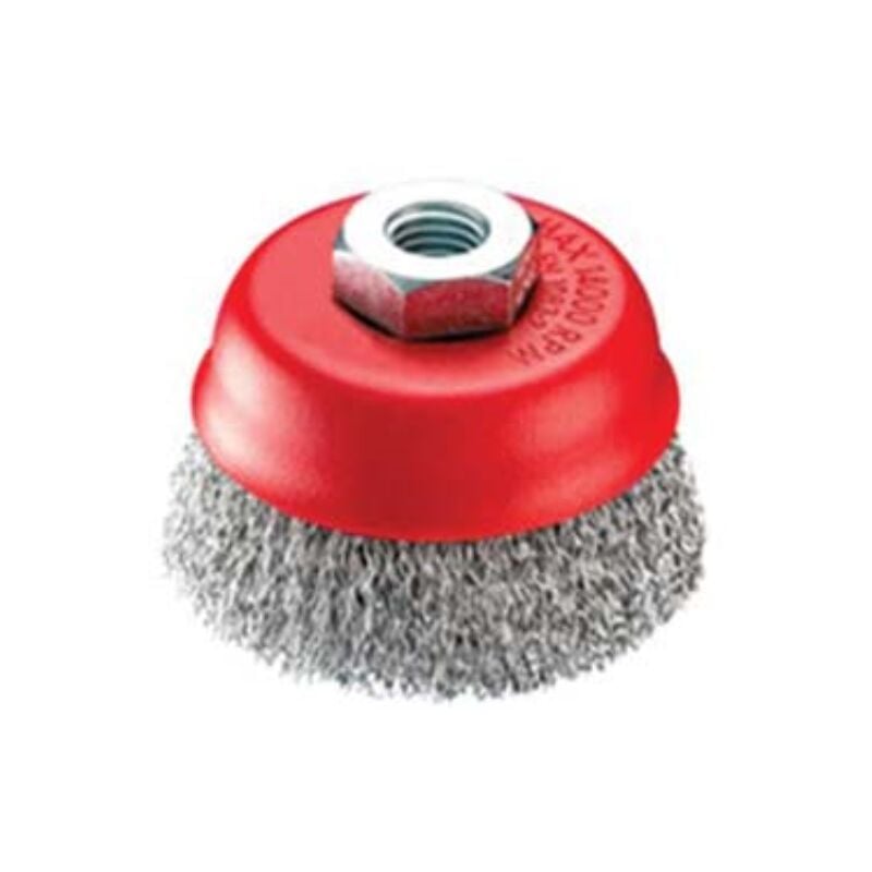 Ø mm.100 foro filettato mm.14 ma fili acciaio ondulato mm 0,30 - coppa rossa Categoria merceologica: Accessori per elettroutensili - Elettroutensili - Spazzole per smerigliatrici angolari