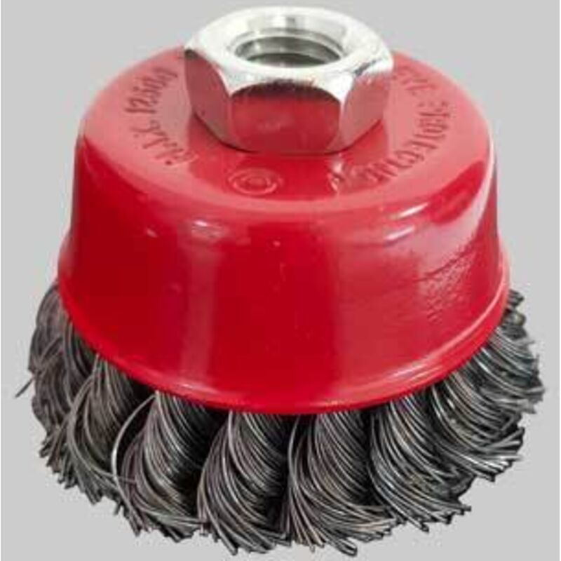 Filamenti in acciaio a mazzetti ritorti. Foro M14. Per utilizzo su smerigliatrici portatili, sia elettriche sia ad aria compressa, per lavori pesanti di sgrossatura, e finitura di saldature e sbavature. Spazzola a tazza ideal star ritorta ø 80 mm IDEAL STAR Spazzole acciaio ideal star