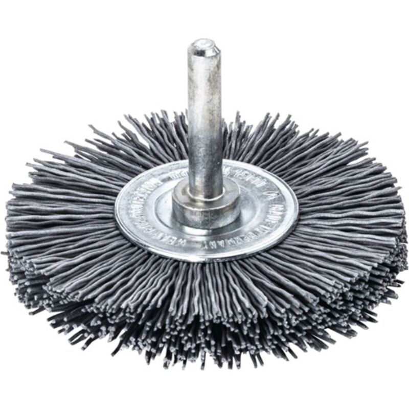 Setole abrasive in carburo di silicio · per sbavare acciaio inossidabile e alluminio · arrotondamento abrasivo e ideale del bordo · per il bloccaggio in smerigliatrici a mano o alberi flessibili · Albero Ø 6 mm Altre caratteristiche tecniche: · Granulometria: 120 · velocità: 15000min-¹