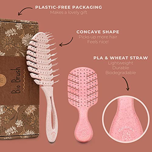 OTTIENI 2 SPAZZOLE BIO in sofisticate tonalità rosa fard. Una è una spazzola districante di dimensioni standard, che ti aiuterà molto in bagno durante o dopo la doccia, come pure in qualsiasi altro momento per districare quei grovigli.