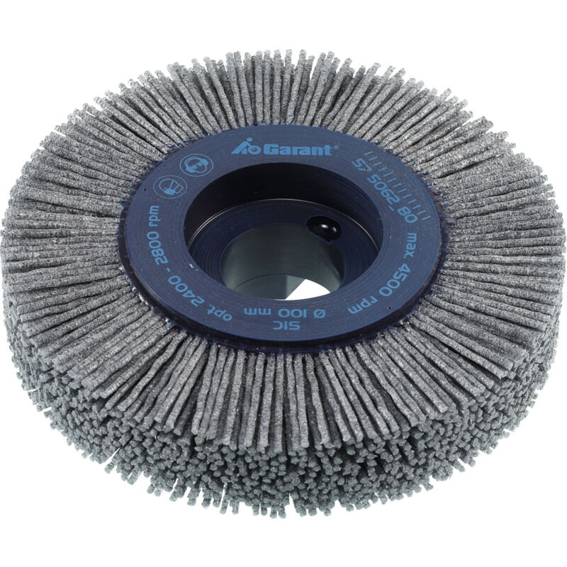 Spazzole circolari con setole abrasive molto spesse (dotazione completa) colate nel platorello in plastica. Elevata stabilità dimensionale grazie a setole che si supportano a vicenda. Durata molto elevata. Setole in nylon con percentuale di grana carburo di silicio molto elevata per impiego universale. Con scanalatura longitudinale per il serraggio su portafrese con trascinatore frontale (DIN 6357) e attacchi universali per mandrini portafresa (DIN 6358). Vantaggi: * Ripassatura subito dopo il processo di asportazione truciolo. * Risultati riproducibili grazie a una grana abrasiva continua. * Sicurezza dei processi grazie all'elevata stabilità e precisione dimensionale. * Montaggio rapido e sicuro senza ulteriori accessori. * Elevata precisione di concentricità radiale. Uso: Su centri di lavorazione CNC e nella robotica, preferibilmente nella rettifica con lubrorefrigerante. Per la lavorazione di superfici laterali e interne: sbavatura precisa (ad es. filettature), arrotondamento di