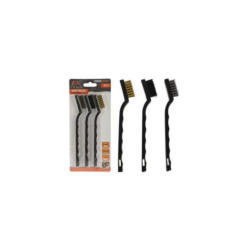 Set di tre spazzole metalliche con diverse durezze per lavorare molti supporti, dal legno al ferro.