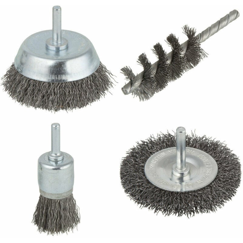Dettagli tecnici Contenuto 1 pz. Caratteristiche Per trapani, per la rimozione della ruggine e la pulizia, per preparare i lavori di saldatura Per metalli, pietra Materiale: filo di acciaio.Contenuto: 1 spazzola metallica a disco, ø 75 x 10 mm 1 spazzola metallica con barattolo, ø 75 mm, 1 spazzola metallica cilindrica ø 28 x 60 x 90 mm, spazzola metallica con pennello, ø 25 mm, manico: ø 6 mm. Incluso nella consegna null Requisiti di sistema null