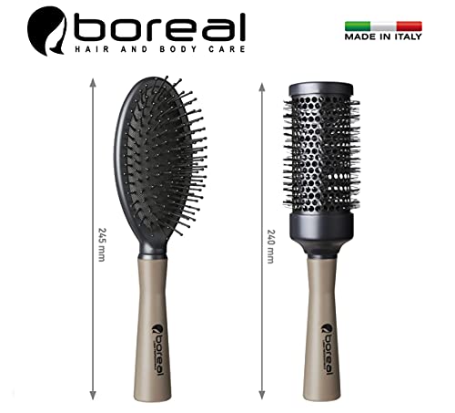 Set spazzole professionali. Spazzola ovale pneumatica + rullo termico diametro 45 mm. Picco alzaciocca inserito nel manico. Linea boreal.
