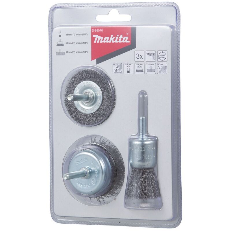 Set di 3 spazzole per trapano Makita D-66070 Caratteristiche tecniche Set di 3 spazzole per trapano Makita D-66070: Diametro (D): 25 / 50 / 50 mm Supporto del filo: 6 mm Diametro del filo: 0,3 mm Passo di velocità di carico (Hi): 4 500 min.